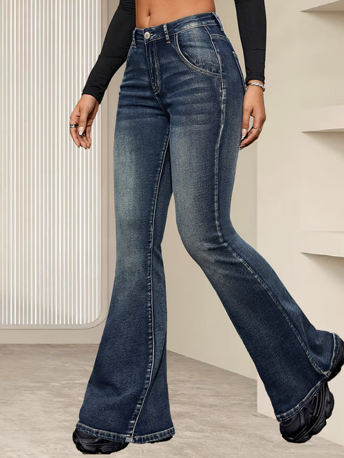 1pc Elegant High-Waisted Flare Jeans for Women, Vintage Blue Denim with Cat Whisker Detail, Stretch Fabric, Solid Pattern, Long Length, All-Season, Button Closure, Woven Weave