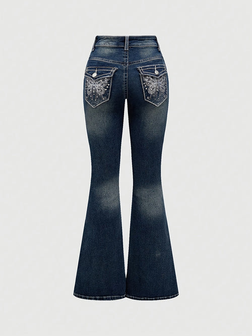 2024 Women's Hand-Embroidered Rhinestone Back Pocket Flared Jeans - Stretch Comfort Washed Denim, Elegant Machine-Washable All-Season Casual Pants, Comfortable Fashion, Fashionforward Design, Detailed Embroidery